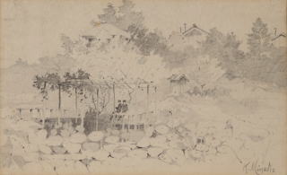 さらに、この初期の鉛筆画から感じ取れるのは、この景色に対してどういった感覚を表現すればよいかを意識しながら描いていると思われるところです。手前から中景にかけて描き込まない部分を敢えて設けることですっと絵のなかへと入っていける、包み込まれるような感覚。そして爽やかで浮き立つような気分や雰囲気などを見て取ることができるでしょう。